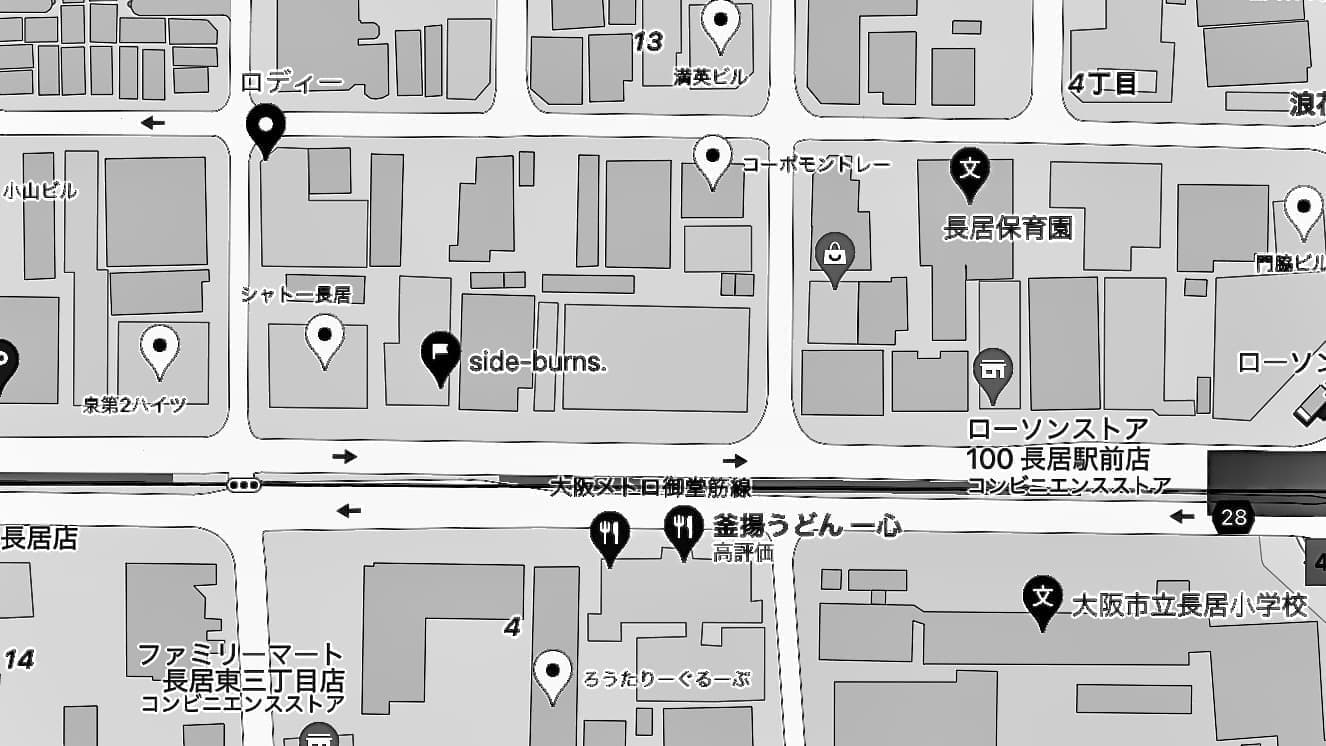 | 電車でお越しの方へ | 地下鉄 長居駅6番出口より徒歩5分。 長居駅を出て長居公園を背に100円ローソン側にあびこ筋を直進すると右手にレンガ造りのサロンがside-burns.です。 真隣にもサロンがありますのでご注意ください⚠︎ |
